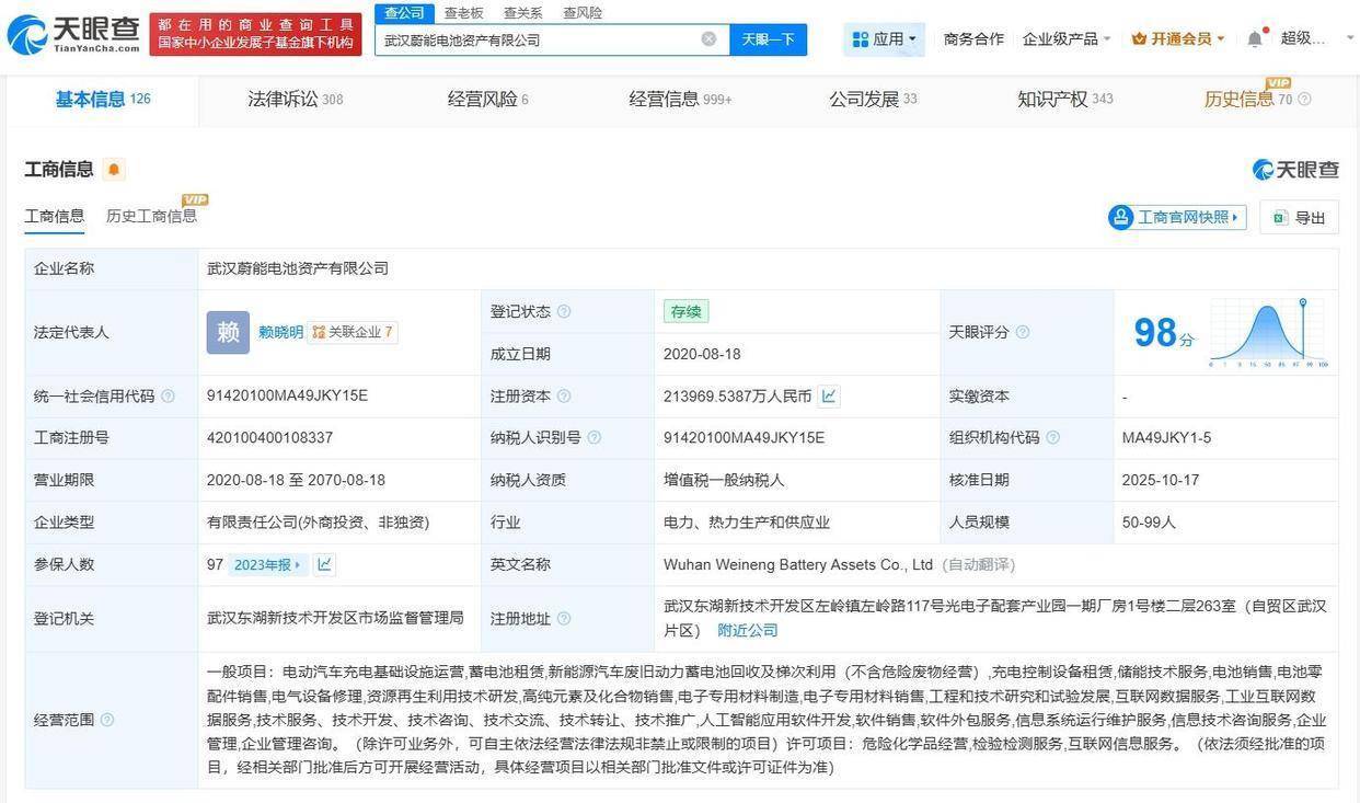天眼查App显示,近日,武汉蔚能电池资产有限公司发生工商变更,注册资本由约18.7亿元增至约21.4亿元,增幅约14%,同时部分高管发生变更。该公司成立于2020年8月,法定代表人为赖晓明,经营范围包括电动汽车充电基础设施运营、蓄电池租赁、新能源汽车废旧动力蓄电池回收及梯次利用等财盈策略,由蔚来控股有限公司、宁德时代新能源科技股份有限公司、武汉光谷产业投资有限公司等共同持股。