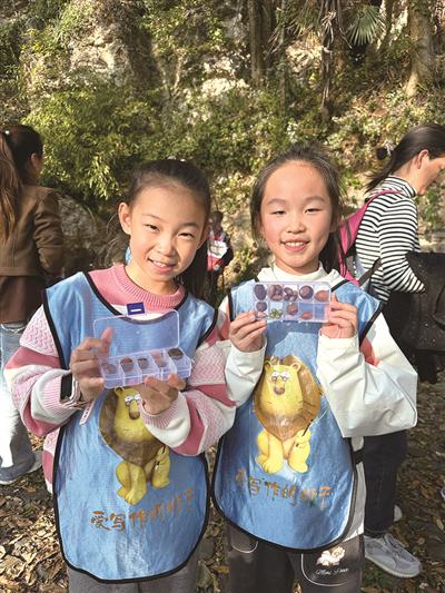 大家从水乐洞出发,一路蜿蜒前行,途经烟霞洞、南高峰、唐樟,最终抵达慧因高丽寺。登山途中,小记者们细心观察着沿途的植物,还兴致勃勃地收集了不少秋果。麻栎、油麻藤、拐枣……这些大自然的宝物,都被大家小心翼翼地装进了种子盒中。